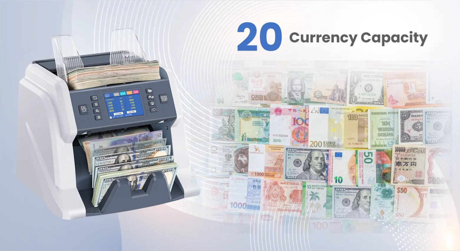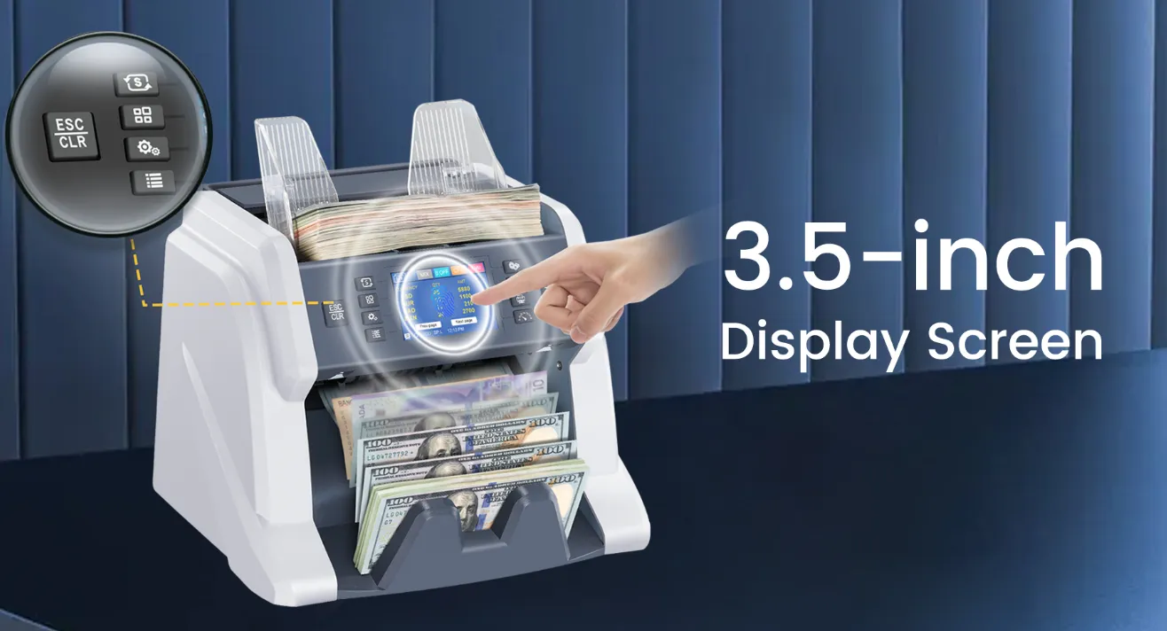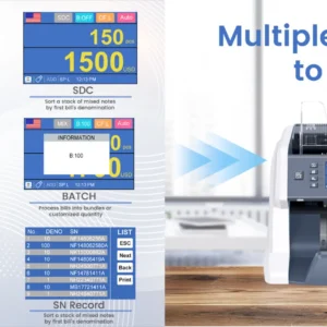 Dotée d’un écran tactile couleur TFT-LCD de 3,5 pouces, l’interface est intuitive, personnalisable et facile à utiliser. Avec une vitesse de comptage allant jusqu’à 1500 billets par minute, une grande capacité de trémie et un empileur efficace, elle répond parfaitement aux besoins des banques, commerces, stations-service, supermarchés et bureaux de change.